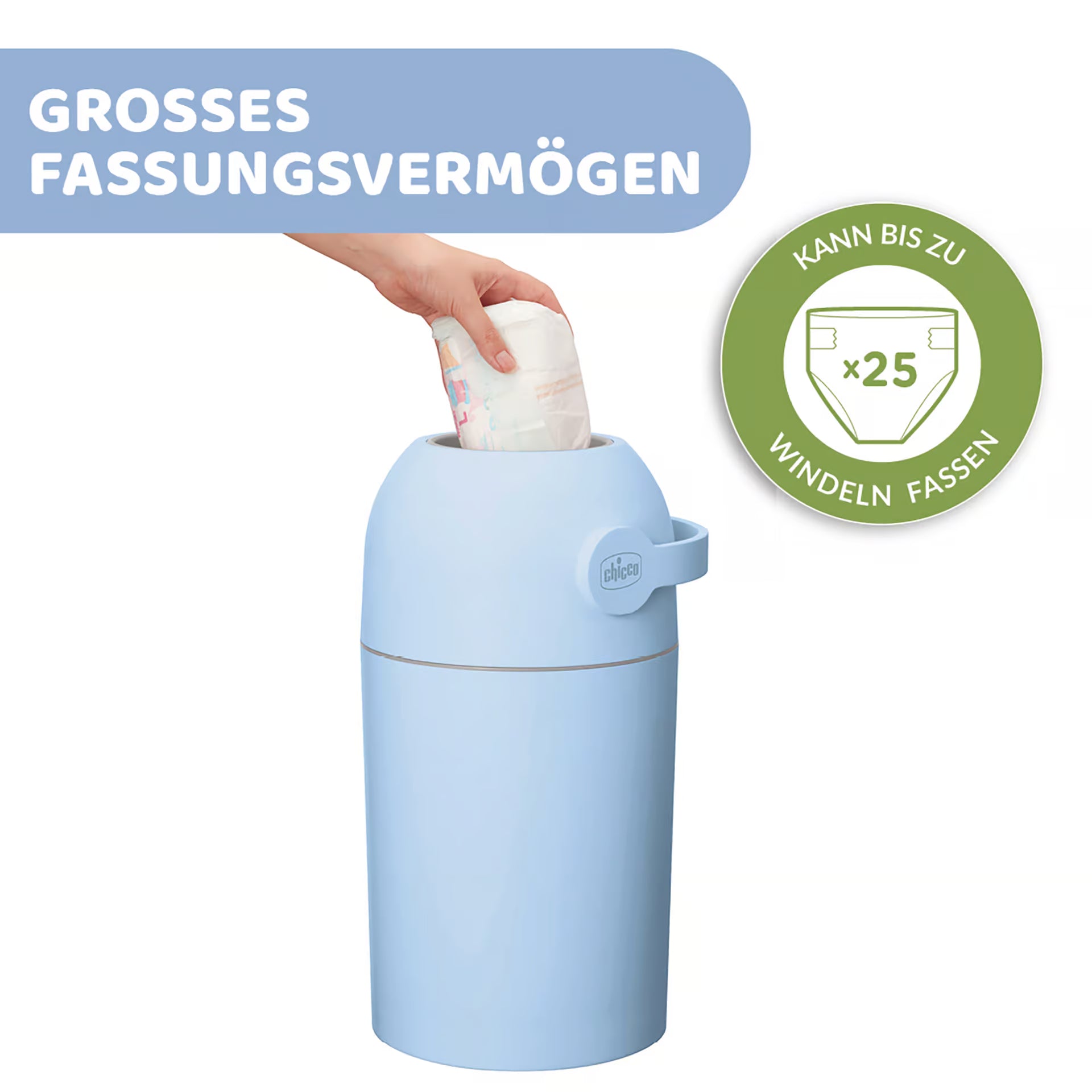 - Trotz seiner kompakten, platzsparenden Maße fasst der Eimer bis zu 25 Windeln