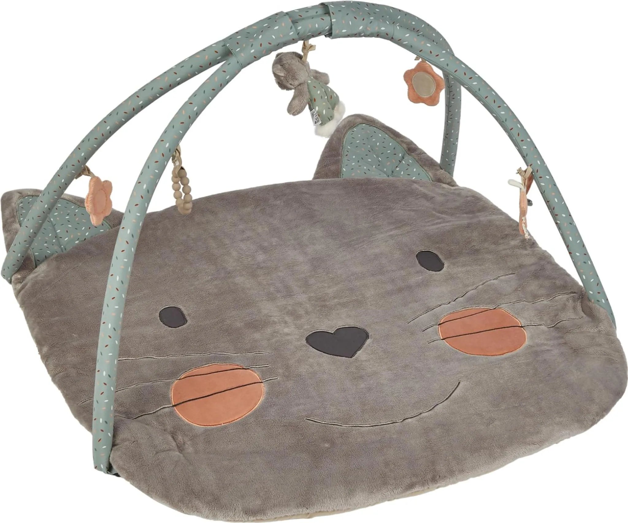 Der Spielbogen Katze Lilly bietet abwechslungsreichen Spielspaß und fördert die Entwicklung deines Babys auf spielerische Weise. Gefertigt aus weichem Flausch und einem niedlich bedruckten Baumwoll-Mischgewebe, lädt er zum Entdecken und Kuscheln ein. Die wattierte Unterlage sorgt für Komfort, damit dein Baby bequem in der Rückenlage spielen kann.
